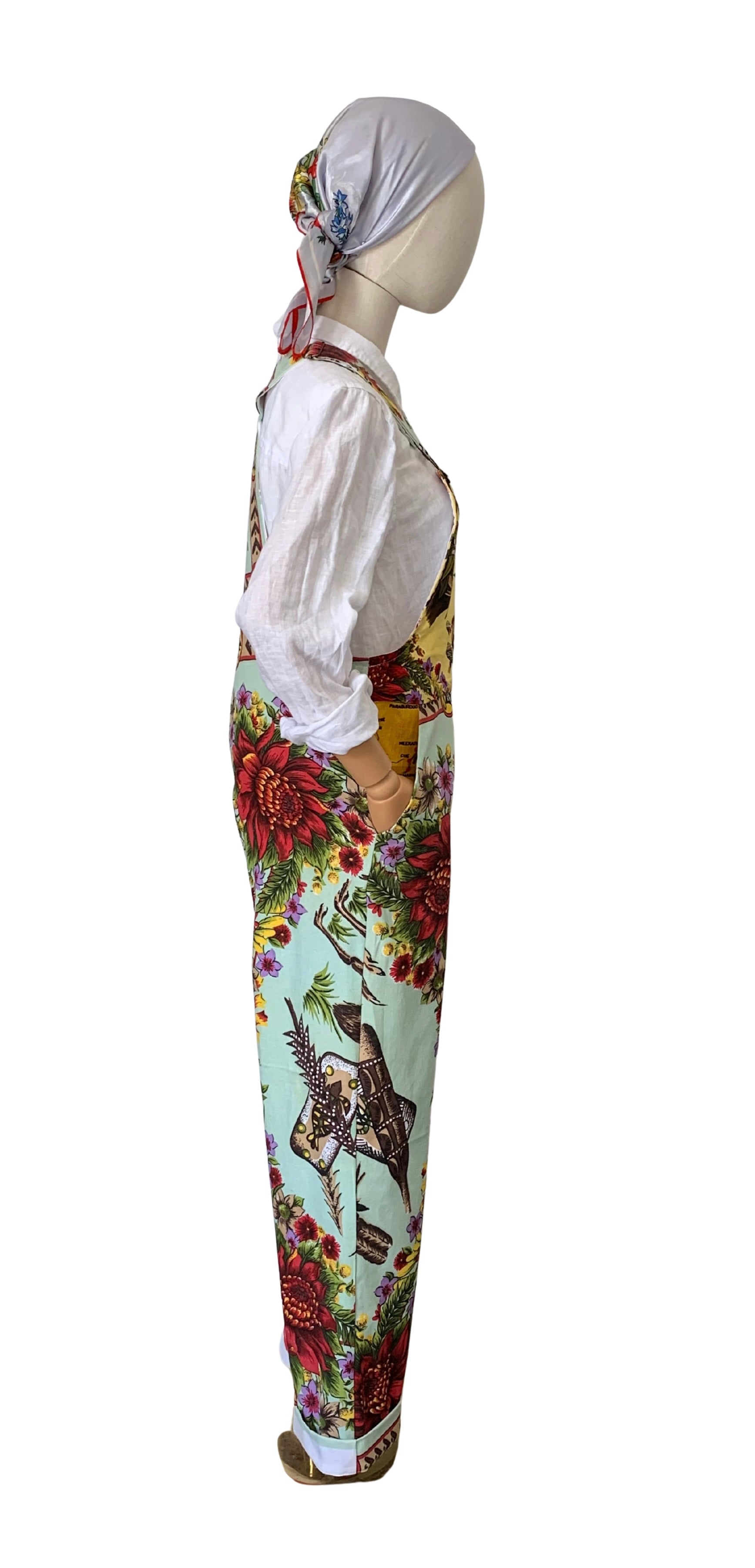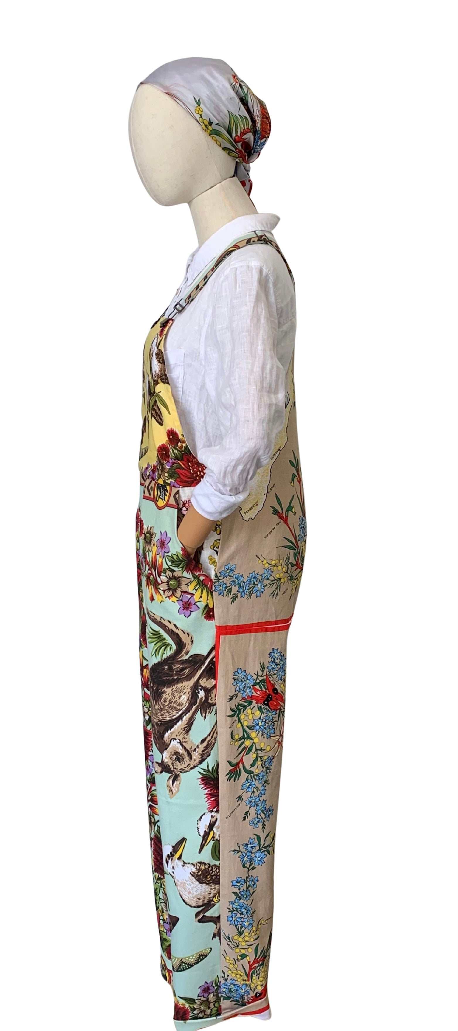 A truly unique piece crafted from vintage Australian tablecloths featuring vibrant native florals and wildlife illustrations. Every panel tells a different story, making these overalls an artful, one-off garment. Deep pockets for comfort and practicality.