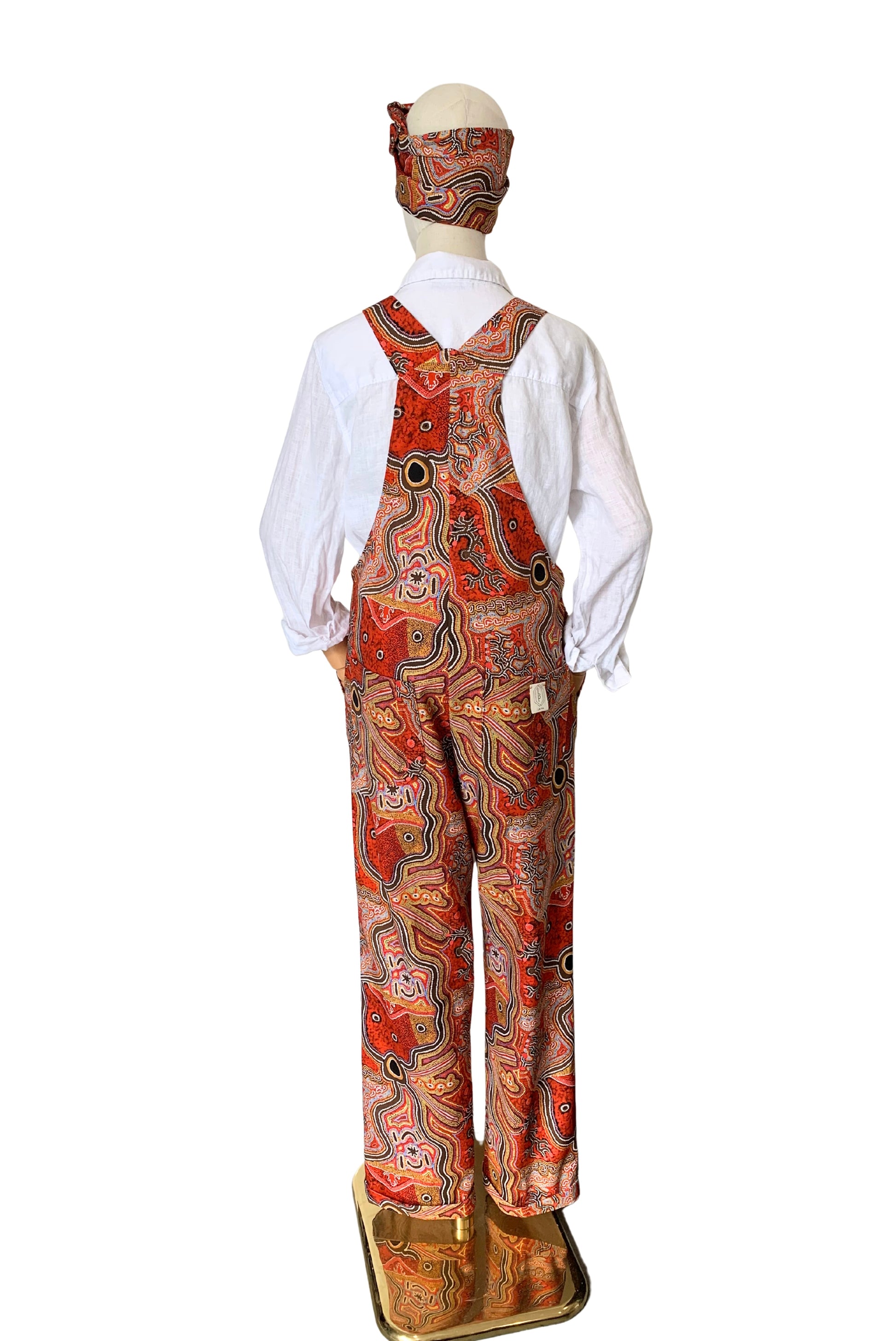 Crafted from a durable medium-weight cotton drill, the Lola Overalls feature the stunning Frog Dreaming print, designed by Indigenous artist Thomas Jangala Rice. Each piece tells a story through its vibrant patterns of red, ochre, and black, celebrating culture and creativity.