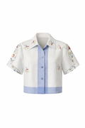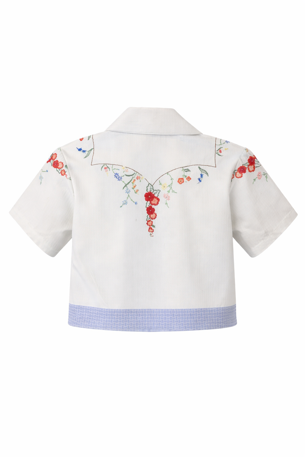 The front features delicate floral embroidery scattered across crisp white cotton, while the back showcases a striking embroidered yoke detail with trailing florals for an unexpected statement. A soft blue patterned panel and hem add contrast and charm, giving this cropped shirt a playful yet refined finish.
