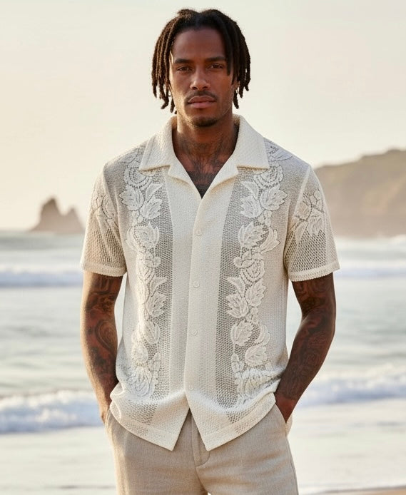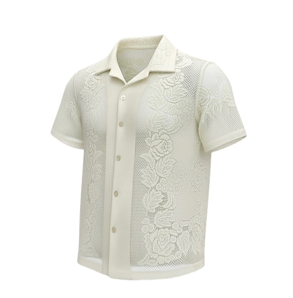 Designed to fit a large man comfortably, this shirt has an easy, relaxed shape with standout lace detailing that makes it perfect for warm-weather styling. Dress it up with tailored trousers or keep it casual with denim — either way, it delivers effortless statement style while staying true to sustainable fashion values.