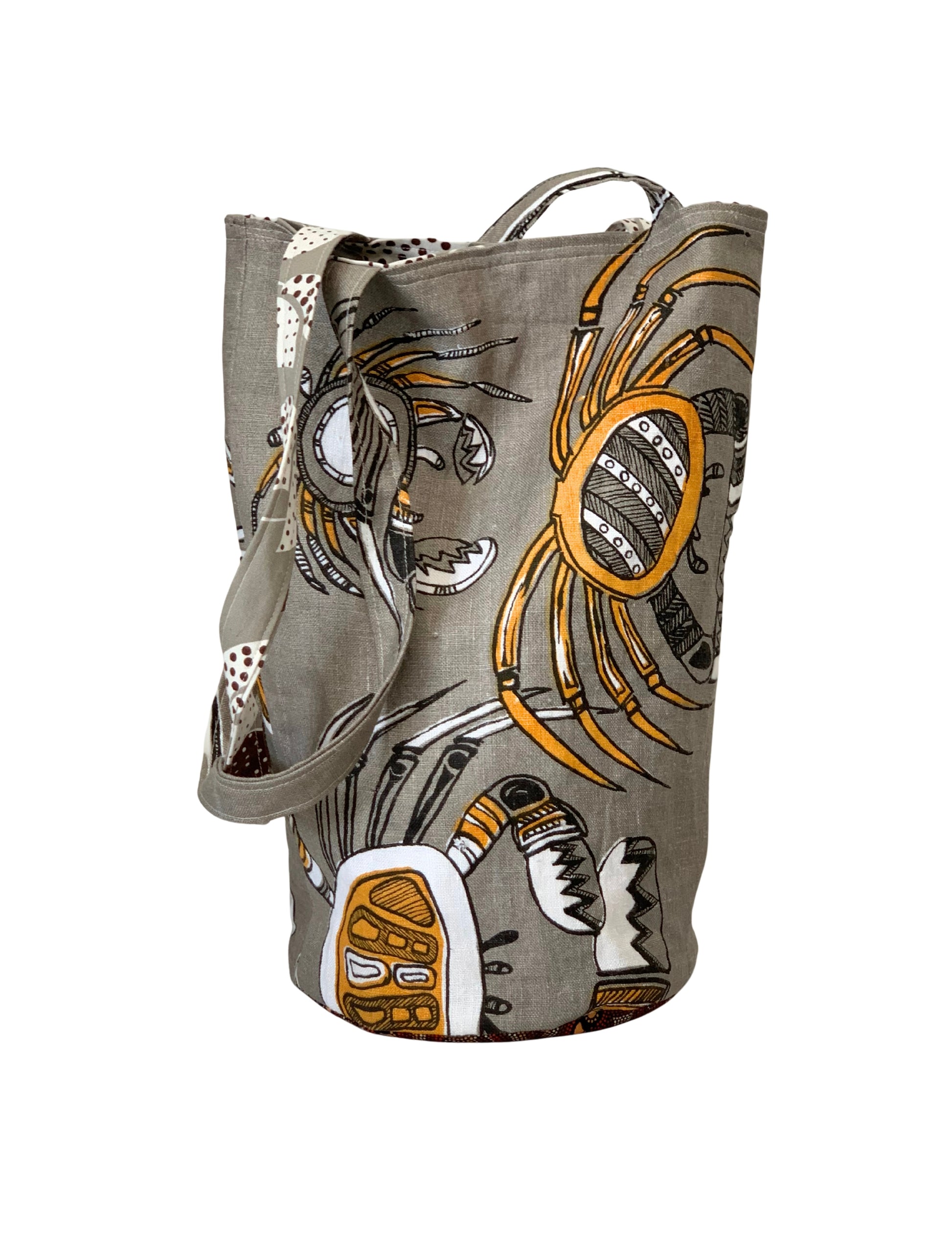 This striking one-off tote features bold Australiana motifs in warm earthy tones. Practical and spacious, with a lined interior and reinforced structure — perfect for everyday use, shopping trips, markets, or beach days.