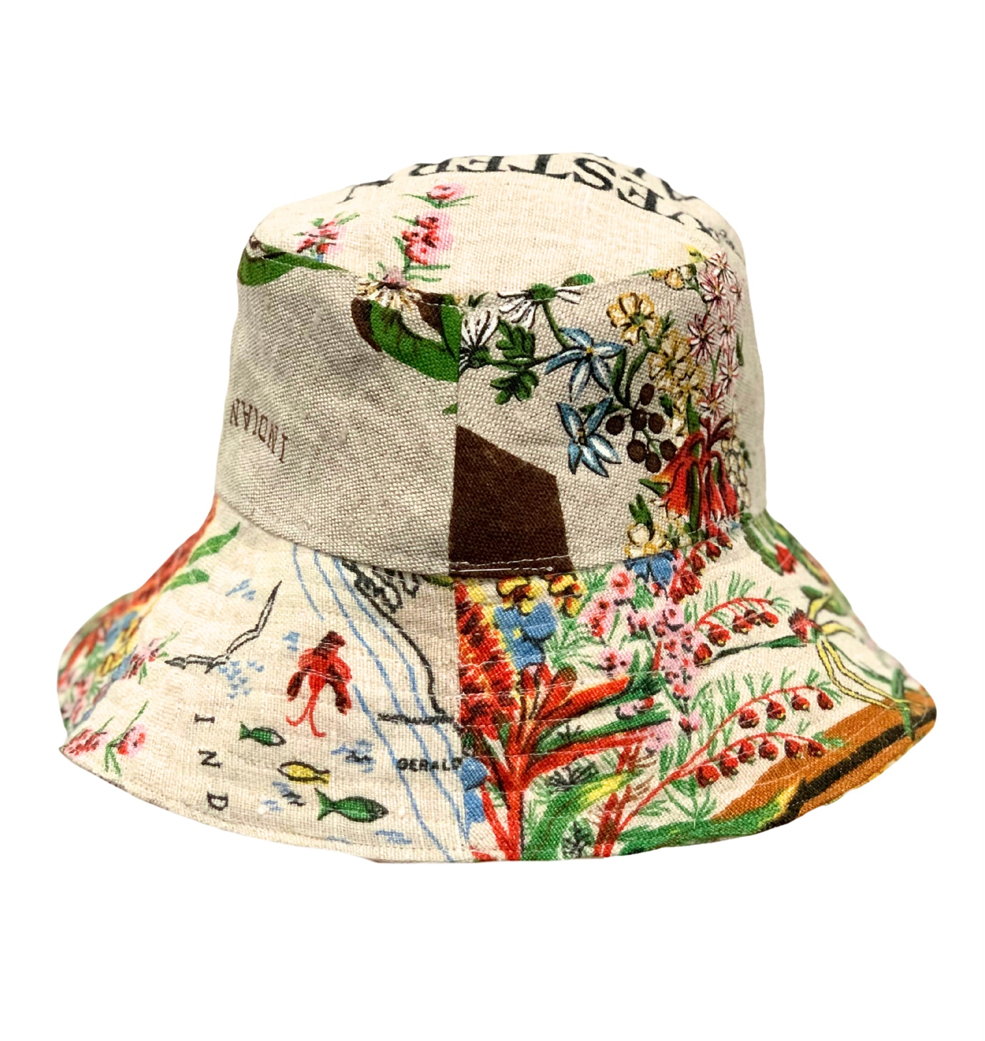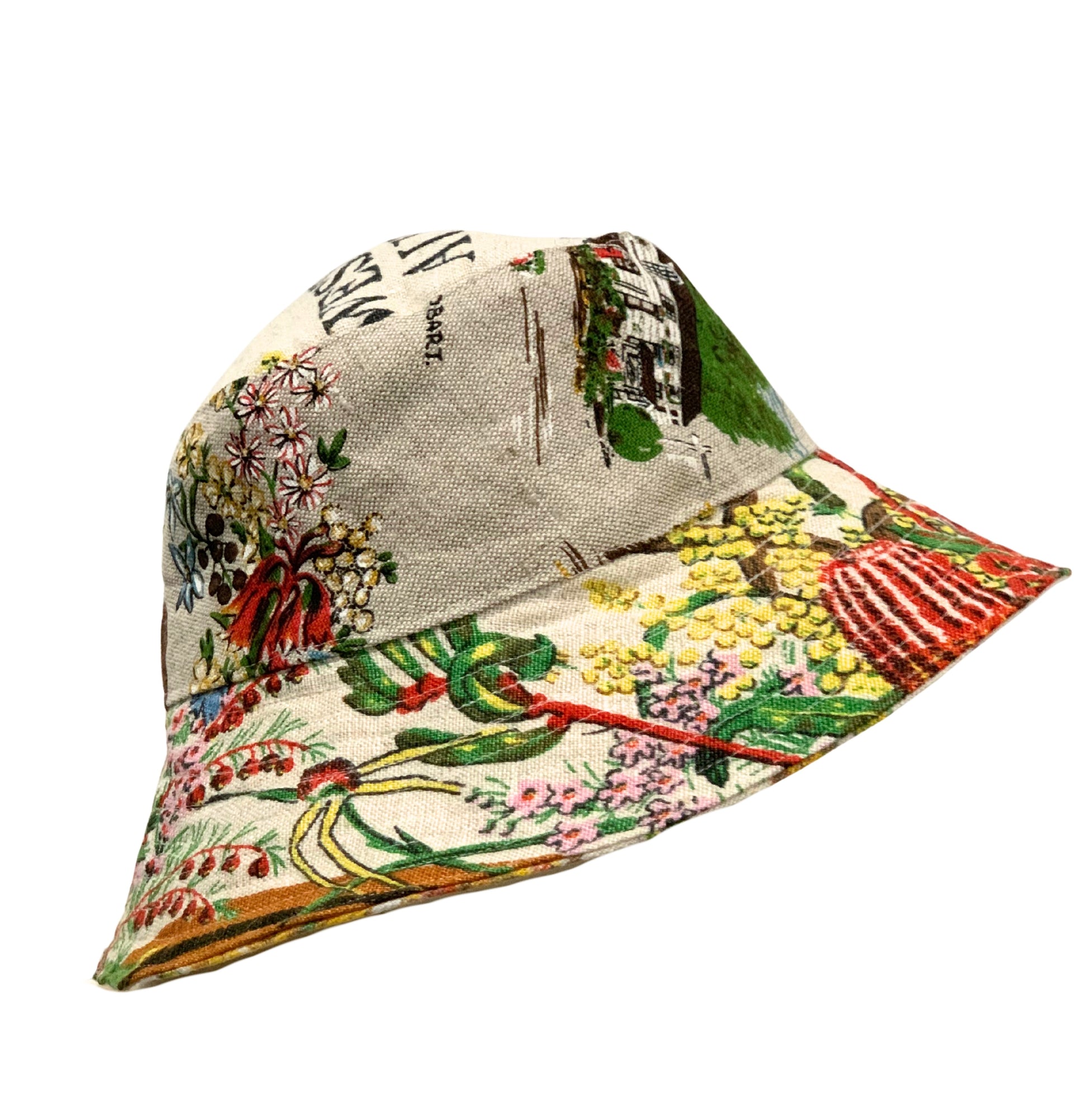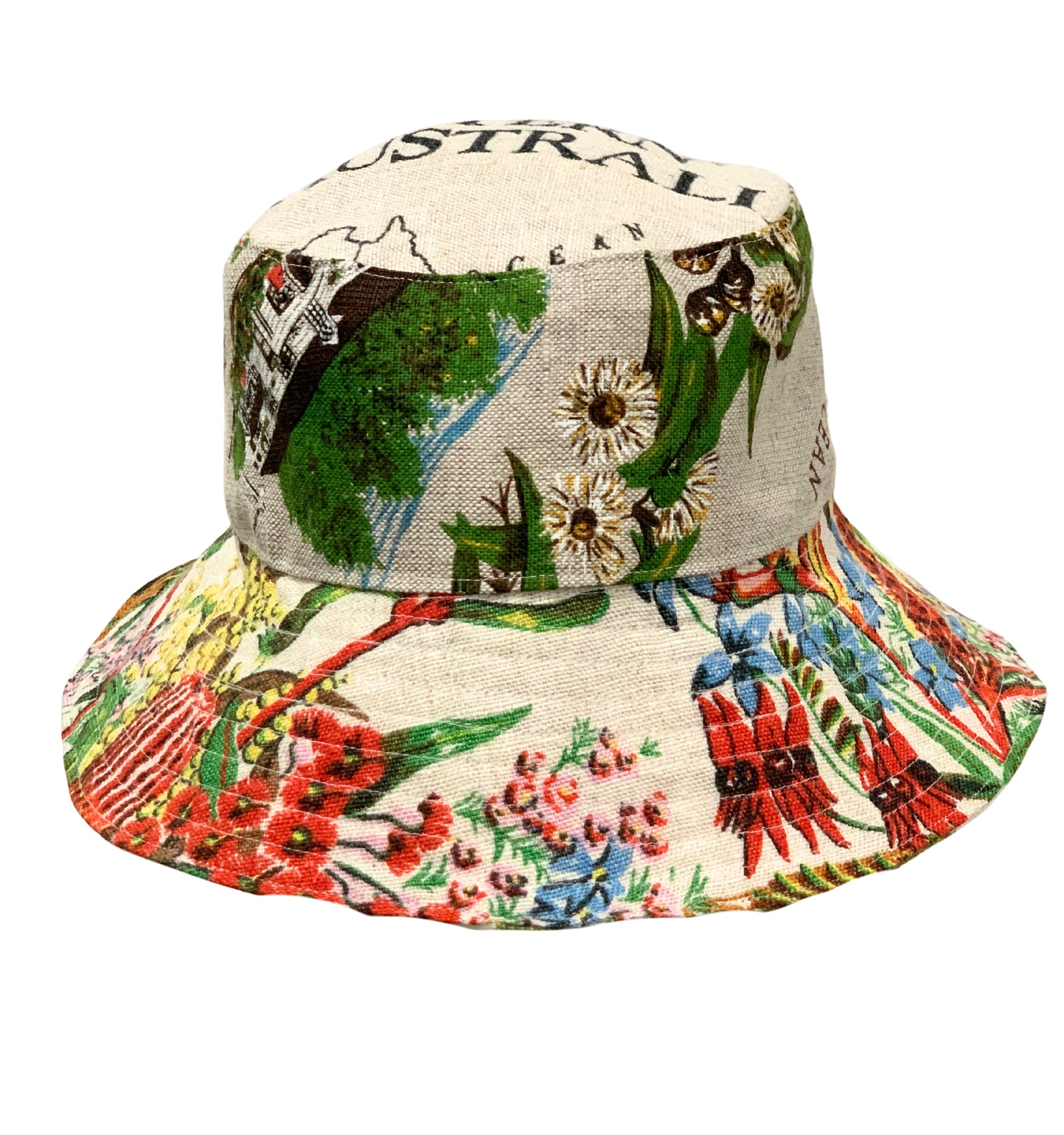 Handcrafted from 100% linen vintage Australian tablecloths. Each hat features nostalgic Australiana prints, reimagined into a wearable, breathable summer essential.