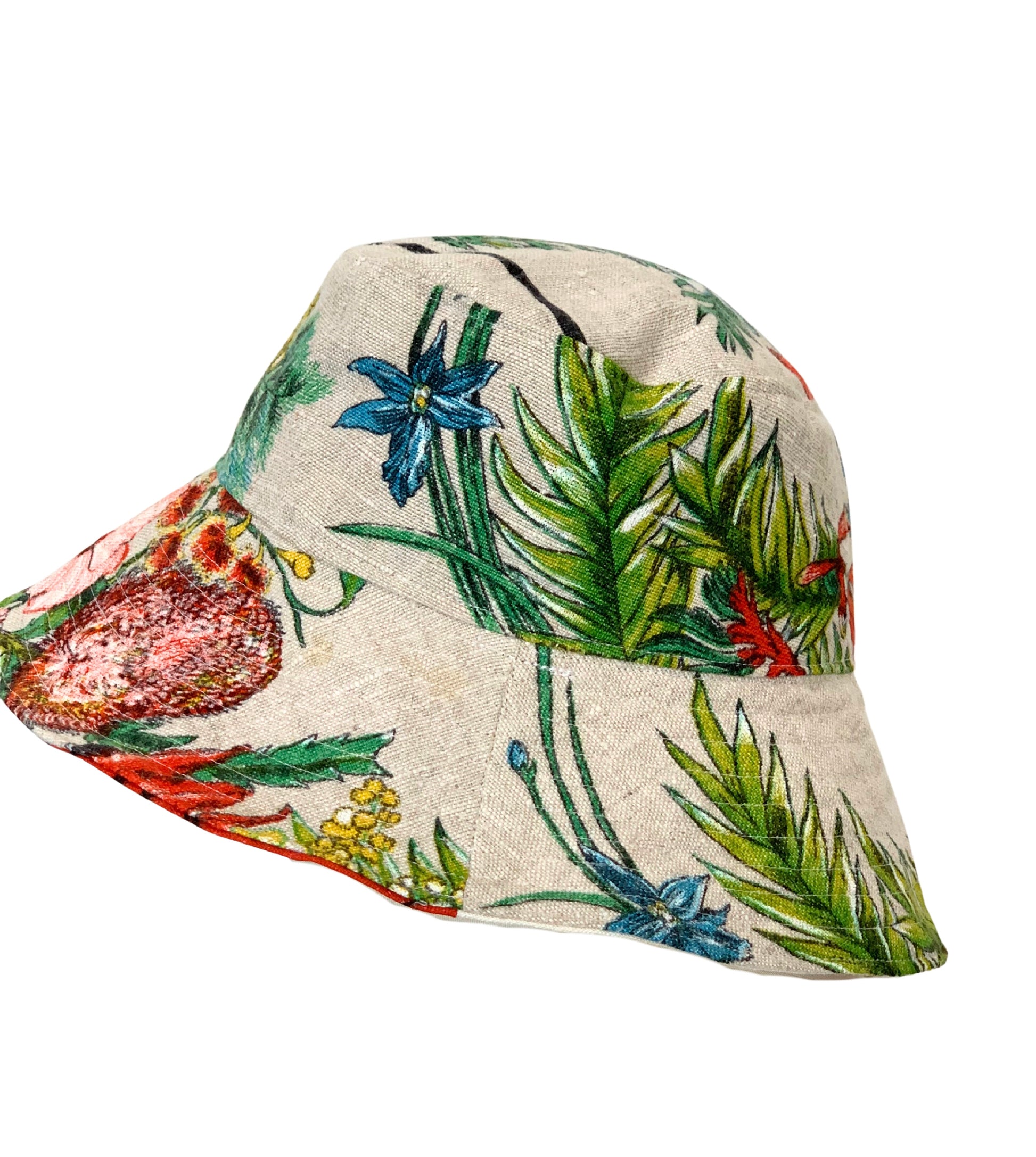 A vibrant, one-of-a-kind bucket hat crafted from upcycled vintage linen featuring bold Australian botanical prints. Fully reversible, offering two unique looks in one. Lightweight, breathable, and perfect for summer.